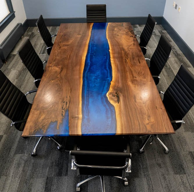 Experience the artistry behind our handcrafted conference tables, meticulously fashioned from aged live edge wood slabs sourced sustainably across the globe
