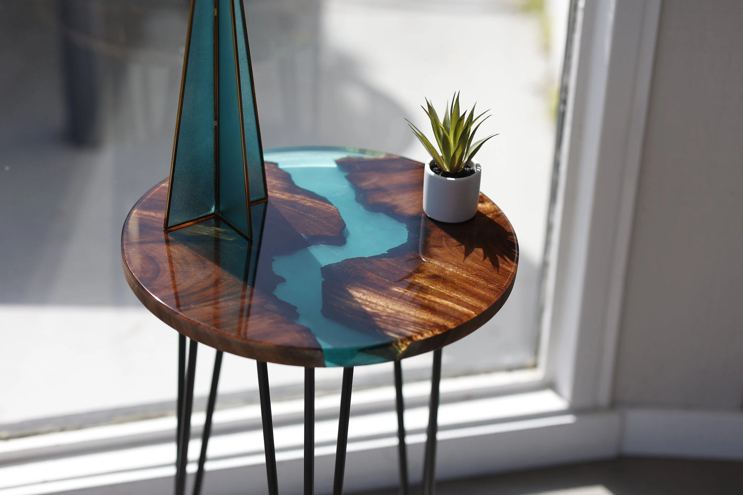 We create ocean wave epoxy art on serving trays, tabletops, counter tops, and any and all flat surfaces! Transform your space with our unique ocean wave epoxy art showcased on a range of flat surfaces such as counter tops and tabletops.